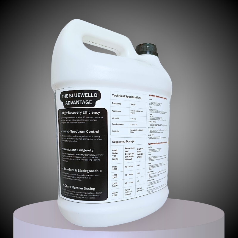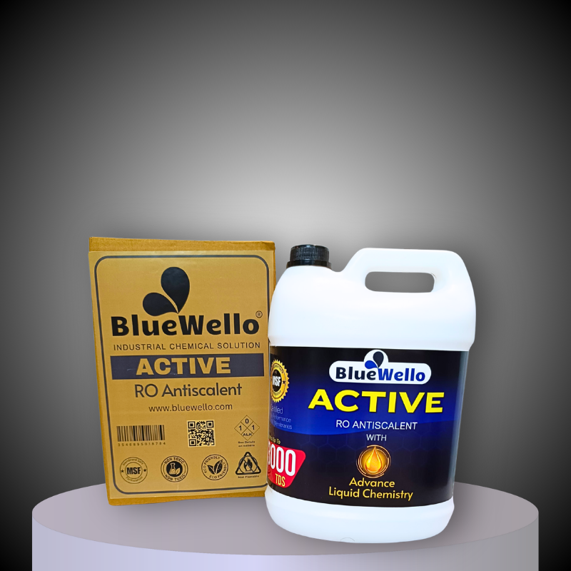 BlueWello ACTIVE RO Antiscalant is a high-performance liquid pretreatment designed to protect Reverse Osmosis (RO) membranes from mineral scaling. Formulated with “Advance Liquid Chemistry,” it effectively handles feed water with up to 4000 TDS, extending your membrane life by up to 50%.