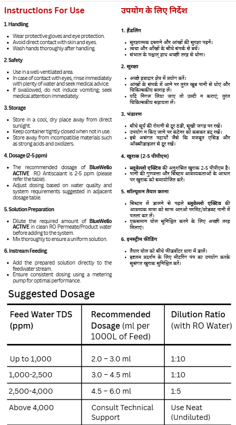 - The recommended dose of BlueWello ACTIVE RO Antiscalnt is 2-5 ppm (please refer the table).