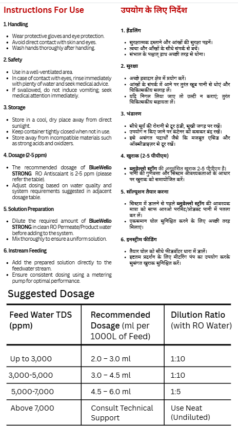 - The recommended dose of BlueWello Strong RO Antiscalnt is 2-5 ppm (please refer the table).