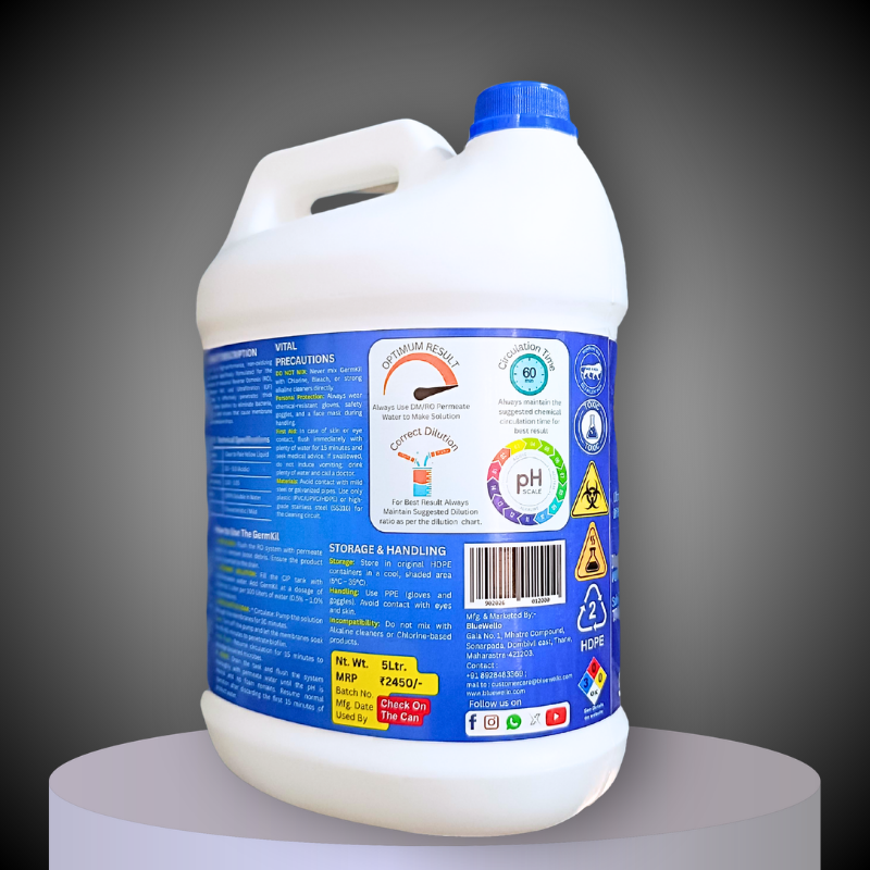 This is a high-purity disinfectant solution used to eliminate microbial growth within the RO system. Unlike standard cleaners, this germicidal formula penetrates the cell walls of microorganisms to ensure the system is sterile. It is also commonly used as a “Preservation Liquid” when the RO plant needs to be shut down for a long period.
