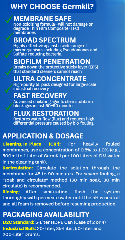 Non-Oxidizing (Usually): Most membrane-grade germicides are non-oxidizing, meaning they are safer for the membrane material compared to harsh chlorine.